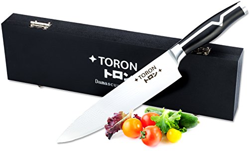 - CHOPPING KNIFE SAFE TO USE WITH WET HANDS AND DOESN'T SLIP WITH DAMASCUS STEEL DESIGN: The Damascus layers on the high carbon stainless steel gives the TORON Classic a beautiful finish, included custom wood box helps to protect your knife and maintain it's sharpness